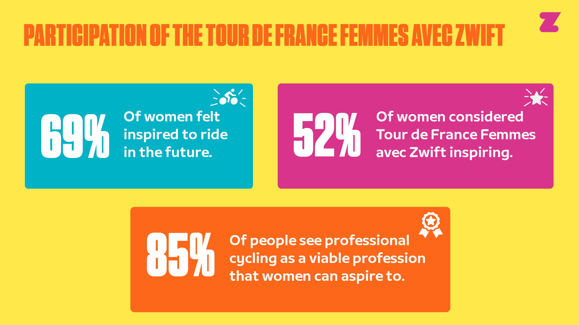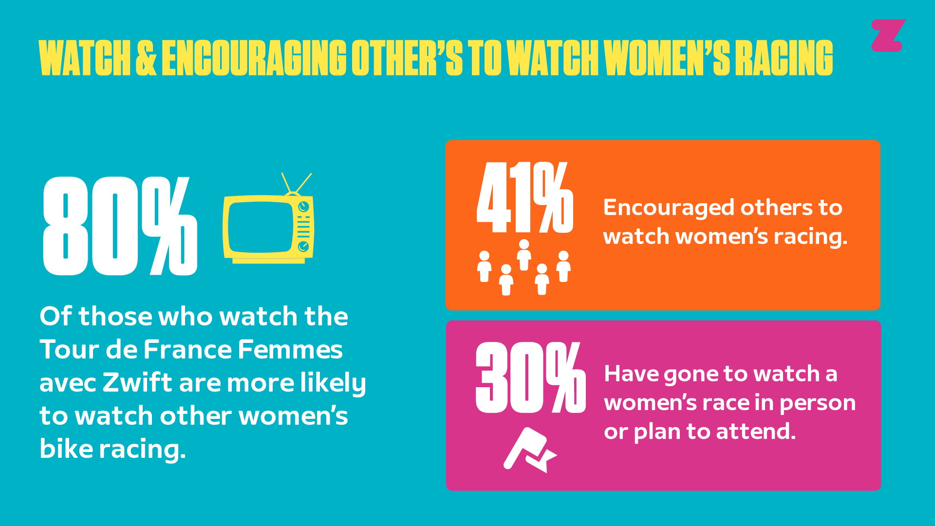 20. De quienes siguieron el Tour de France Femmes avec Zwift, el 61 % dijo sentirse inspirado a querer pedalear más, cifra que sube al 69 % entre las mujeres.