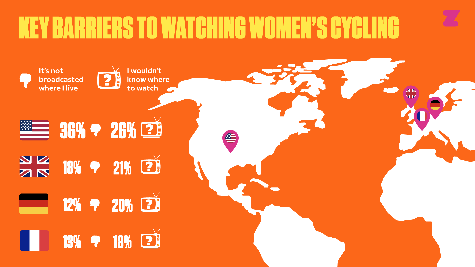 En Estados Unidos, solo el 6 % de las personas afirma seguir el ciclismo femenino, en comparación con el 12 % en Francia. Al profundizar en las razones, ante la pregunta «¿Por qué no ves carreras de ciclismo femenino?», el 36 % de los encuestados en EE. UU. respondió «No se transmite donde vivo», una cifra muy superior a la del Reino Unido (18 %).