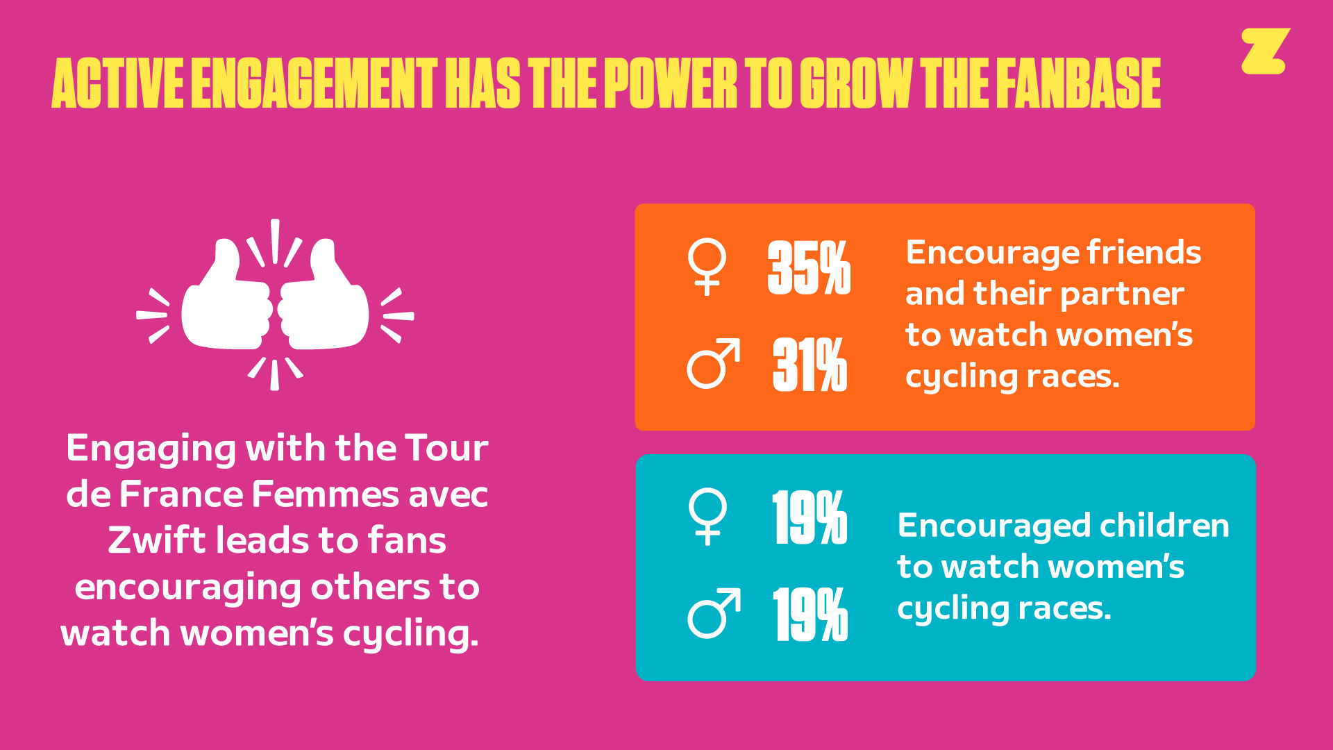 20. De quienes siguieron el Tour de France Femmes avec Zwift, el 61 % dijo sentirse inspirado a querer pedalear más, cifra que sube al 69 % entre las mujeres.